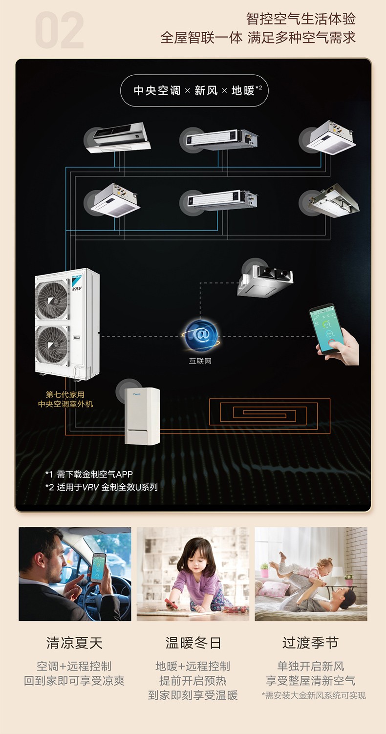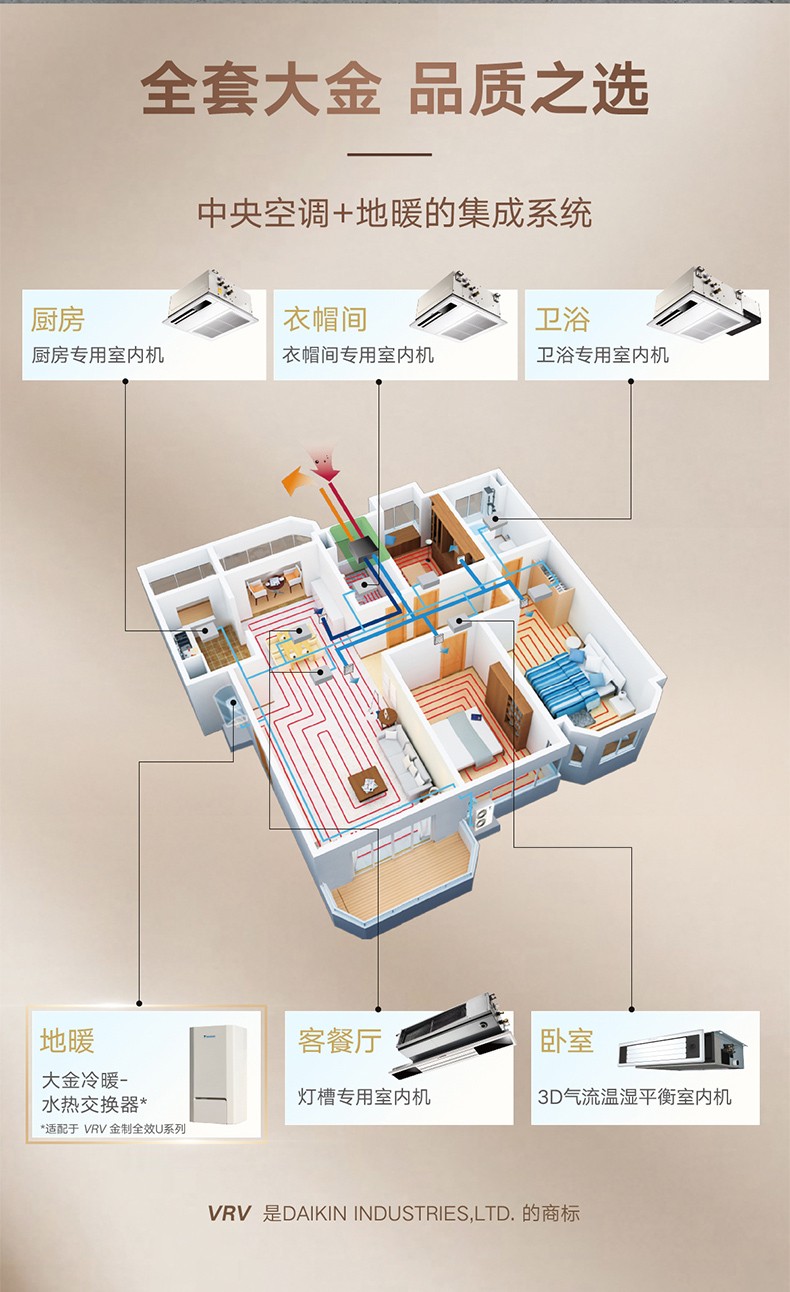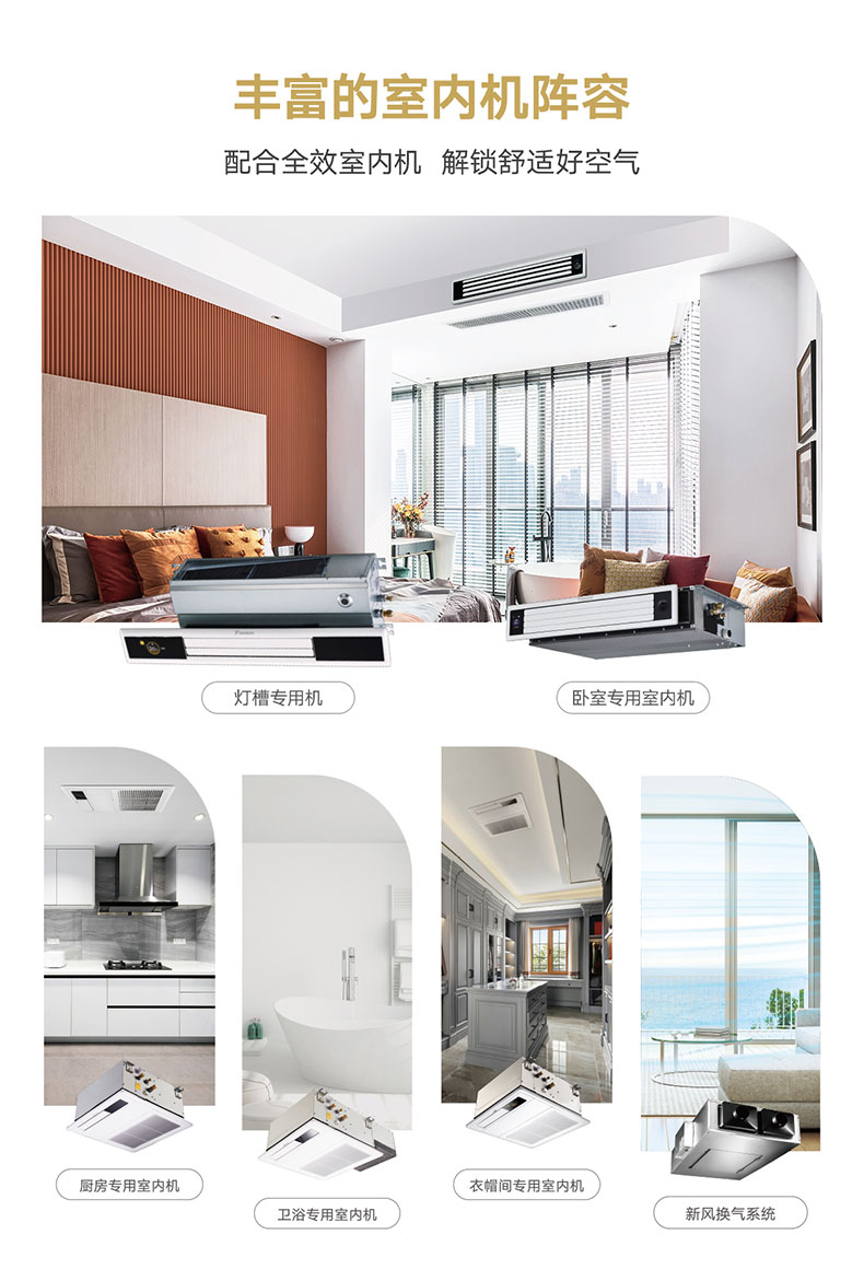 VRV 住宅用U系列全效家用中央空調(diào)實(shí)現(xiàn)濕溫平衡控制,新風(fēng)凈化功能,廚衛(wèi)、衣帽間等空調(diào)需求,冬季空氣源熱泵地暖采暖,足暖頭涼的舒適制熱體驗(yàn)。